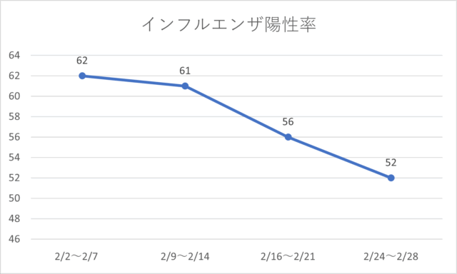 インフルエンザ陽性率も62%から52%へ低下しており、流行のピークは越えつつあると考えられます。