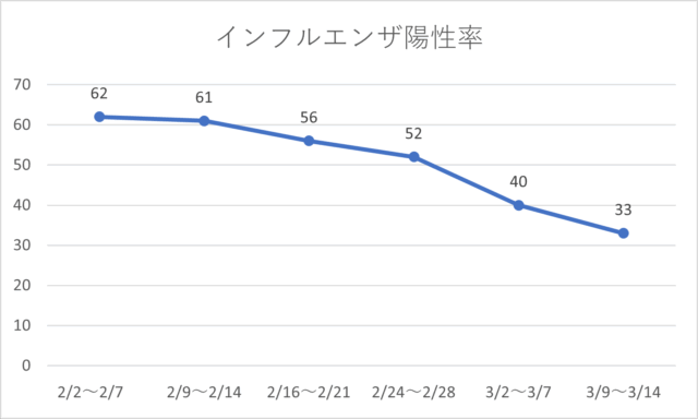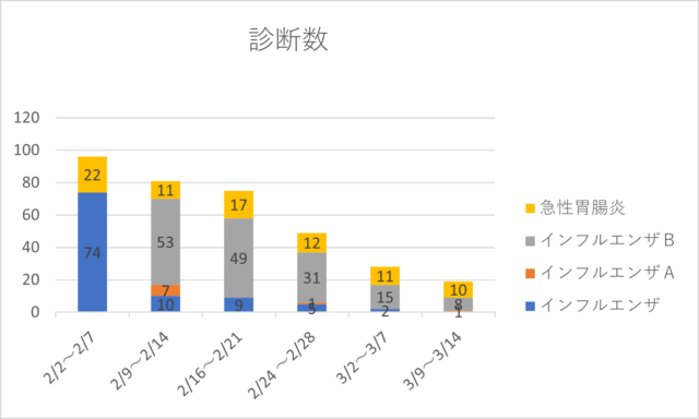 今シーズンはインフルエンザB型が中心に流行し、2月中旬をピークに現在は減少傾向です。一方で急性胃腸炎の患者さんは継続してみられています。体調不良や発熱、嘔吐・下痢などの症状がある場合は早めにご相談ください。
