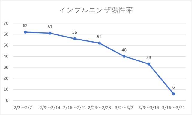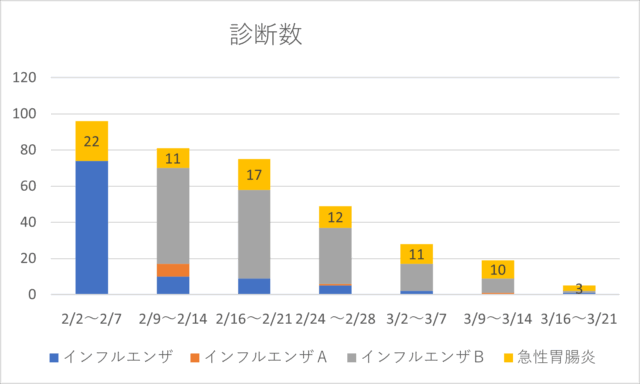2月上旬をピークにインフルエンザは減少し、陽性率も60%台から一桁台まで低下しています。流行は終息に向かっていますが、急性胃腸炎は引き続き発生しています。感染対策を継続しましょう。