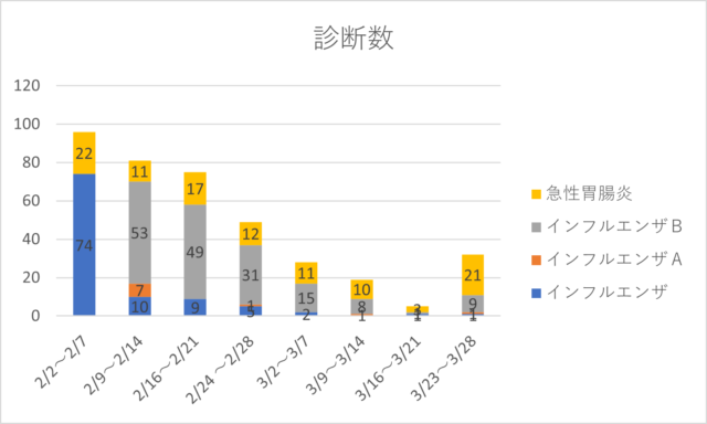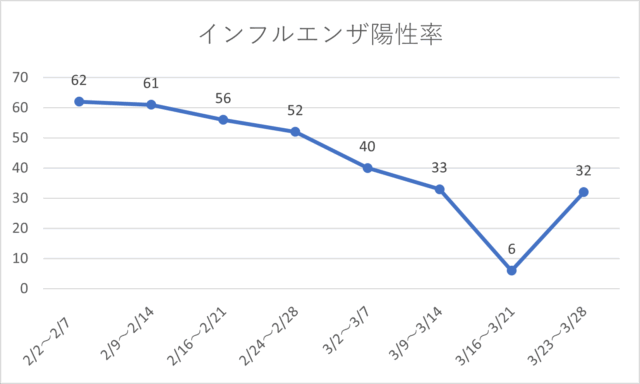 インフルエンザB型は3月中旬は減少していたが、3月下旬は上昇傾向です。